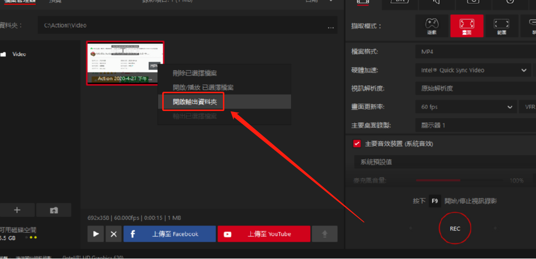 6.紧接着我们鼠标选中录制的视频文件之后用鼠标右键点击它,点击之后在出现的界面中就可以选择“开启输出资料夹”这个选项了,如下图中所示框出的位置所示。