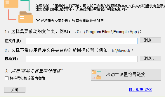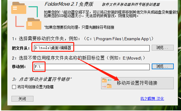 5.最后我们想要移动的文件夹和移动到哪个位置的路径都选择完成之后,点击界面中的“移动并设置符号链接”这个功能按钮就可以开始移动文件夹的操作了。