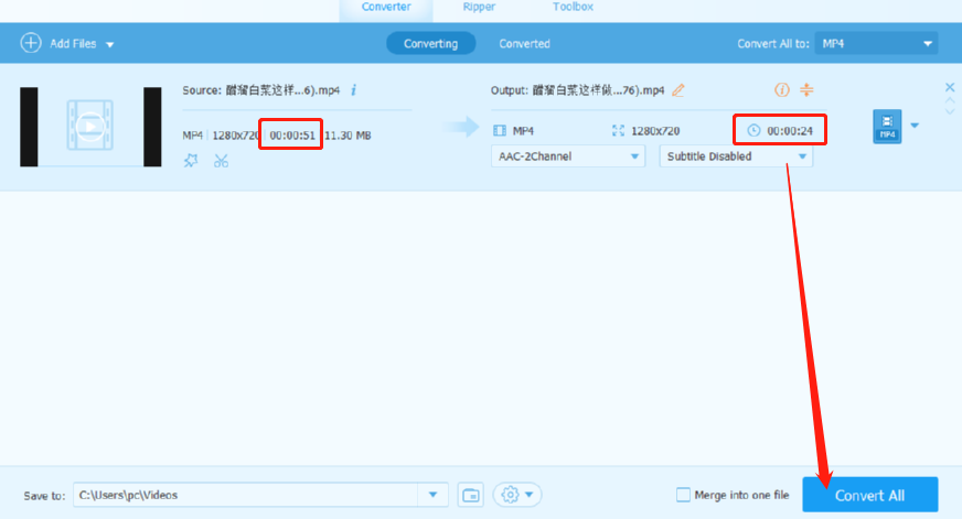 7.将剪切的视频保存下来之后回到软件的主界面,可以看到此时转换后的视频时间就是所选取的剪切片段了,点击右下角的Convert All这个转换全部按钮就可以将剪切之后的视频转换保存下来了。