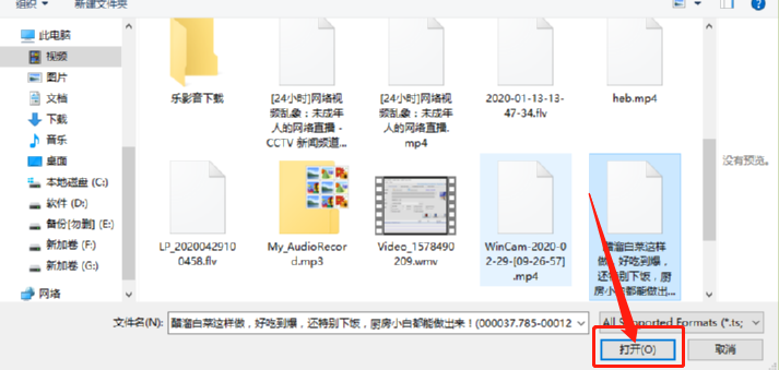 2.点击添加视频按钮之后,我们就会看到一个选择打开文件界面,在这个界面中我们选中想要剪切的视频文件之后点击打开按钮。