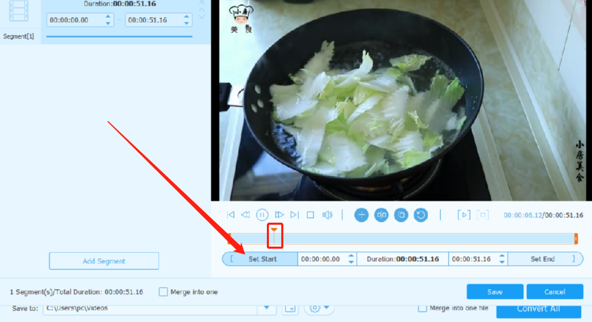 4.点击这个剪刀图标之后,我们在界面中可以看到视频播放进度的标尺,如下图中框出的位置所示,等到它移动到固定的位置时我们点击Set Start按钮可以设置开始时间。