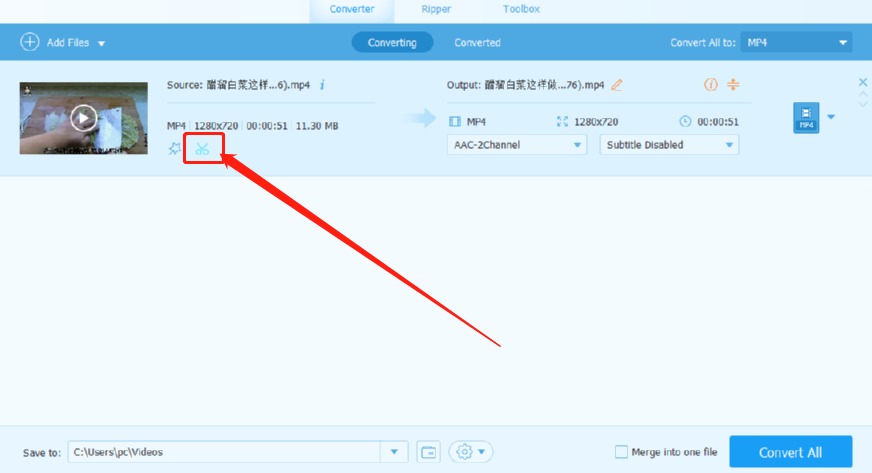 3.点击打开按钮之后下一步在界面中就可以看到视频文件了,我们点击它上面的剪刀图标,如下图中所示。
