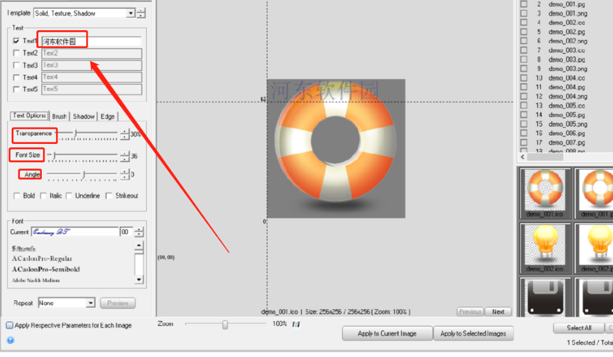 2.进入到水印制作功能界面之后,我们在界面左上方的Text这个文字位置需要输入想要制作成水印的文字内容,在下方可以对水印文字的字体、旋转角度等参数进行设置。