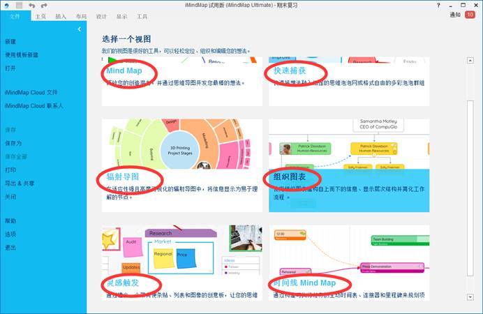 下载安装好iMindMap后,我们打开软件。首先看到的便是选择一个视图的界面。这里有Mind Map、快速捕获、辐射导图、组织图表、灵感触发、时间线Mind Map。选择不同的功能区,我们可以创作不同的思维导图。