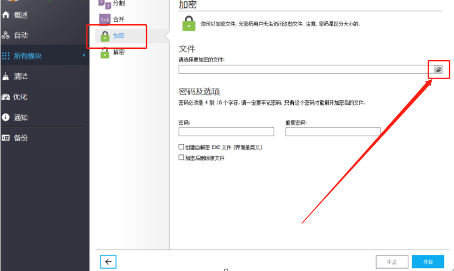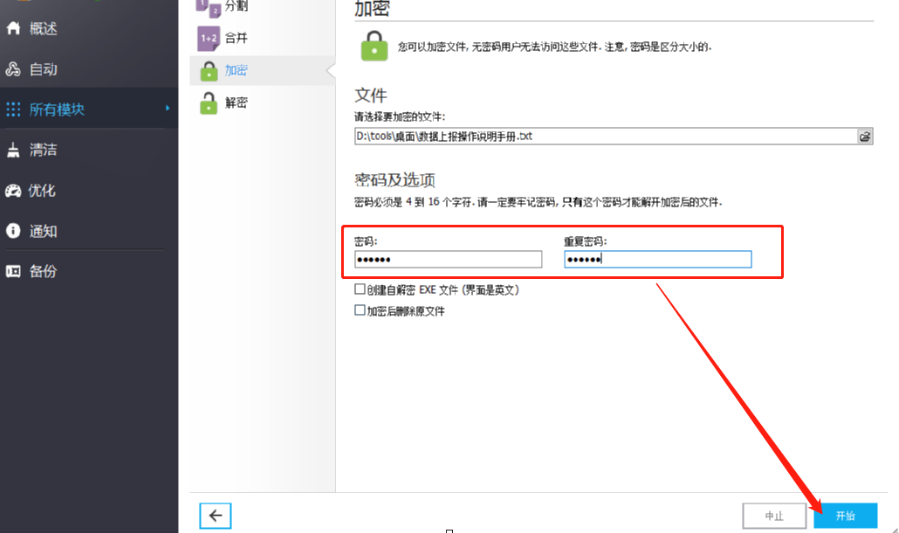 5.点击打开按钮之后文件就选择成功了,然后我们在界面的密码和重复密码输入框中输入相同的密码之后,点击右下角的开始按钮即可开始加密文件。