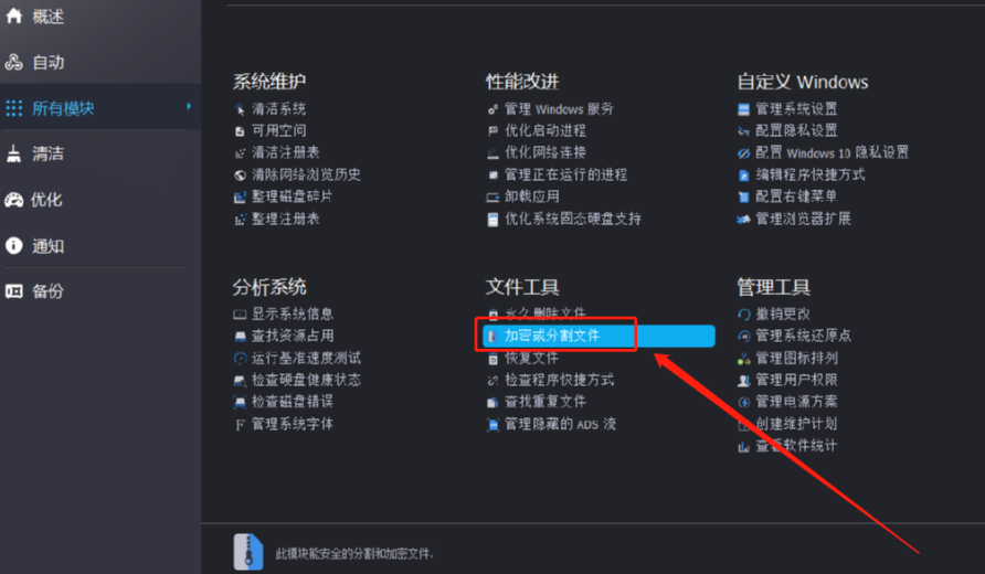 2.点击进入到所有模块界面之后在界面中就可以看到文件工具选项了,然后在文件工具中找到加密或分割文件这个选项点击进去。