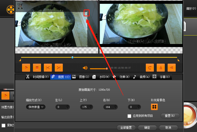 4.进入到裁剪功能界面之后我们可以移动在左边的视频界面移动裁剪区域选择的选框来调整裁剪视频的尺寸位置。