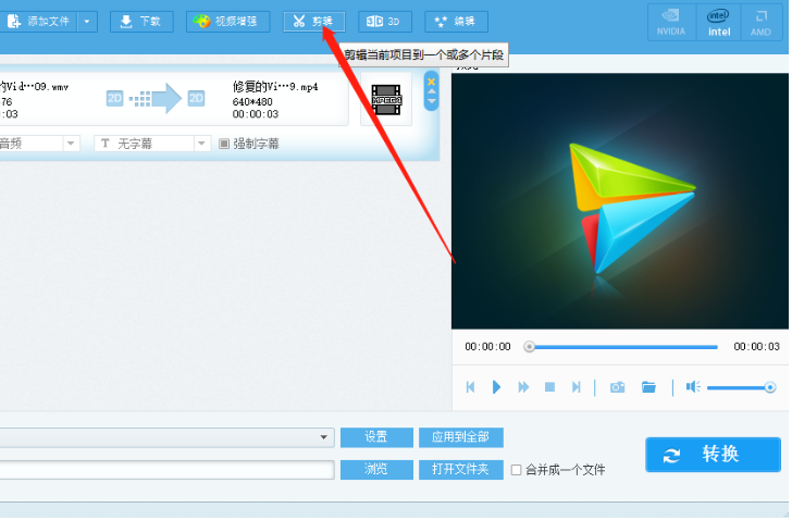 3.点击这个打开按钮之后我们在软件界面就可以看到添加进来的视频文件了,接着需要点击上方的剪辑按钮,如下图中所示。