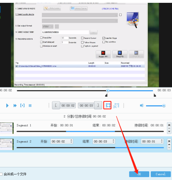 5.选择好视频片段之后,我们点击添加片段图标,如下图中框出的图标所示,点击之后就选取剪切的视频片段了,接着点击下方的OK按钮。