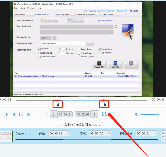 4.点击这个剪辑按钮之后进入到剪辑功能界面,我们需要在视频进度条上移动左右两边的选择时间标尺,如下图中所示,移动选择想要剪切的视频片段。
