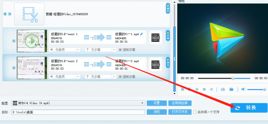 6.点击OK按钮之后选择的这些剪切视频片段就加载到软件的主界面中了,我们点击界面右下角的转换按钮即可将剪切的视频片段转换保存出来。