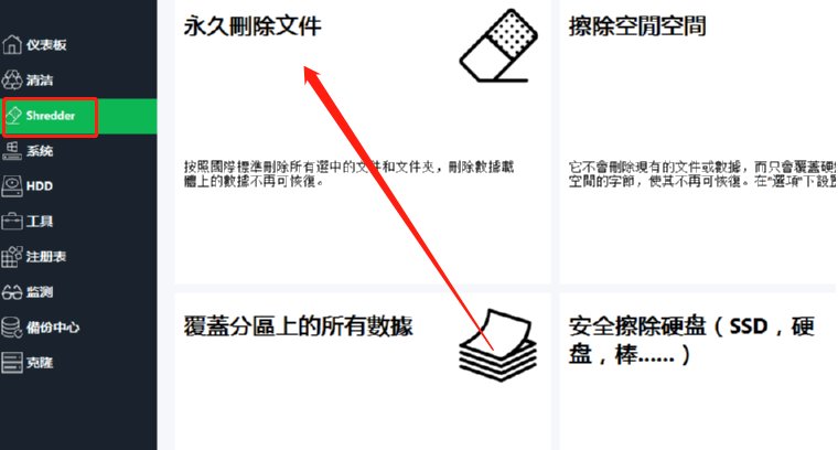 1.首先第一步我们打开软件之后在界面左边列表中找到Shredder这个选项模块,点击之后在右边界面就可以看到永久删除文件这个功能了,然后点击进去。