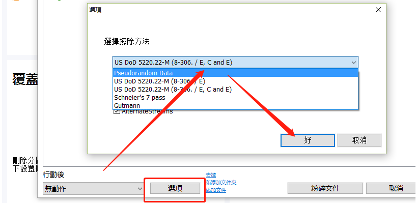 4.点击打开按钮之后下一步点击界面中的选项这个功能按钮,然后在出现的界面中可以选择删除文件的方法,没有特殊需求的用户可以使用默认的删除方法。