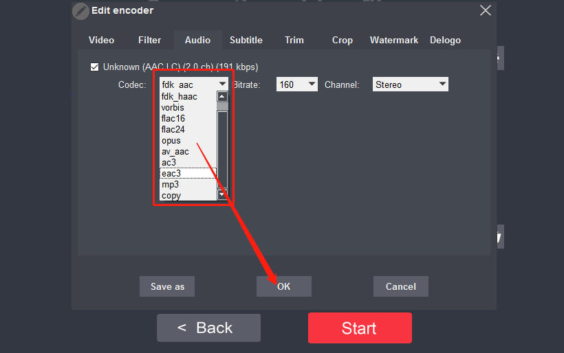 6.勾选这个选项之后我们点击Codec这个编码格式选择的下拉列表,在其中选择目标编码格式之后点击OK按钮。