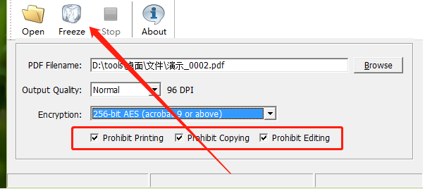 5.选择好加密算法之后我们需要勾选加密的权限,有禁止改写、禁止复制、禁止编辑这个三个选项,全部勾选之后点击上方的Freeze这个按钮即可开始加密。