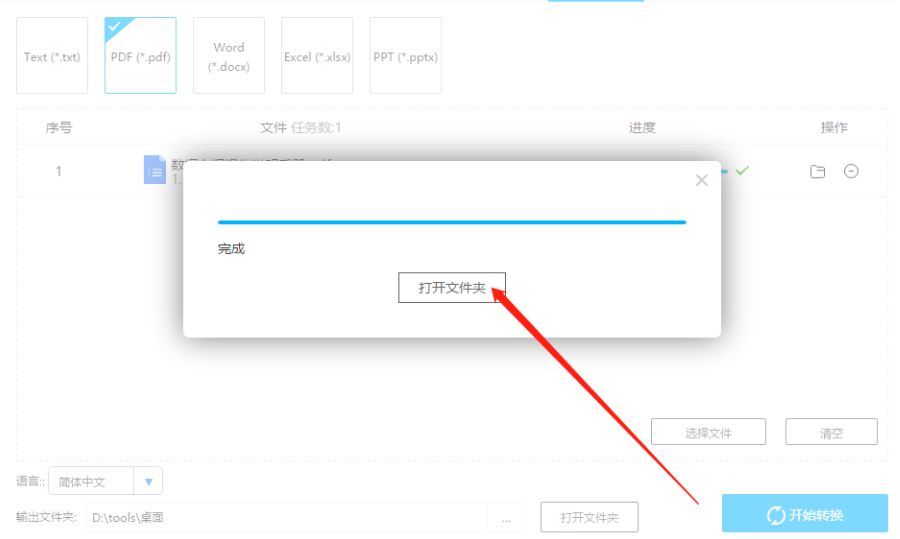6.等到最后识别完成,我们就可以看到软件界面中有一个完成的提示,我们点击打开文件夹按钮即可查看转换识别之后的文件。