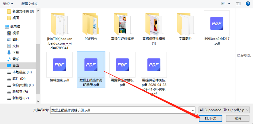 2.点击选择文件按钮之后会打开一个选择PDF文件的界面,在这个界面中我们选中目标PDF文件之后点击打开按钮。