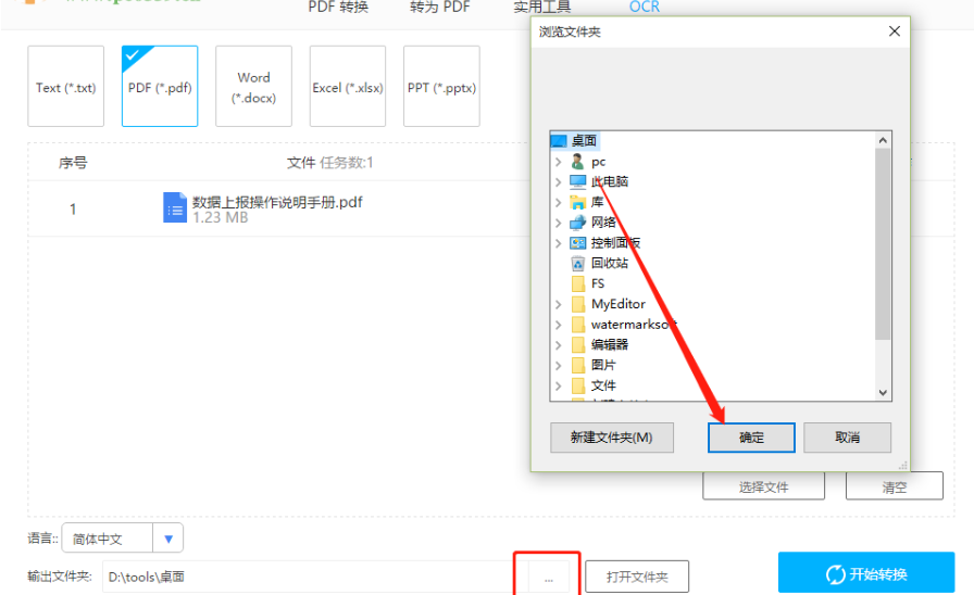 4.选择好想要识别的语言类型之后,下一步点击输出文件夹右边的三点按钮,然后在打开的界面中自定义选择输出文件夹。