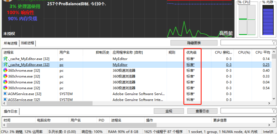 4.进程的优先级经过调整之后,在软件的主界面中也是可以看到调整过后的优先级的,如下图中所示,其他进程可以重复这个方法进行调整。