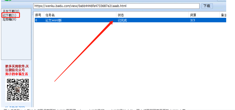 4.等到下载完成之后我们在界面左边点击已下载这个功能选项,在界面中看到下载好的文档之后双击下载好的这个任务列表。