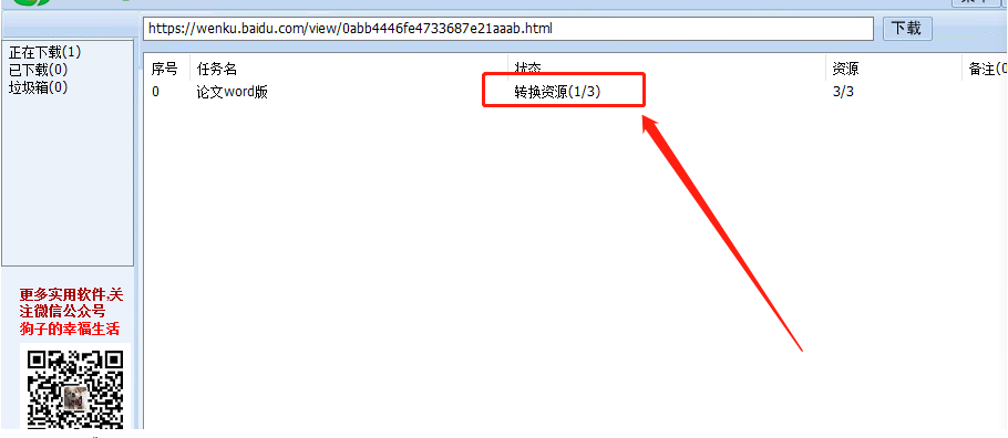 3.点击下载按钮之后软件就会识别下载该链接中的文档,并且在下载完成之后会自动转换文档的多个格式,在状态这一栏可以看到下载和转换的进度。