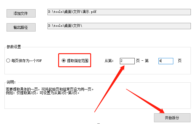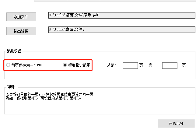 5.选择拆分指定范围页面的话我们在后面输入想要拆分提取的页面范围之后,点击右下角的开始拆分按钮即可进行拆分文件的操作。