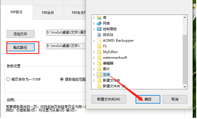 4.选择好输出储存位置之后在参数设置界面就可以选择拆分PDF文件的方式了,可以每一页保存为一个PDF文件,也可以选择拆分指定范围的页面。