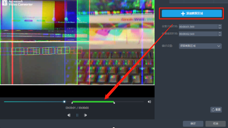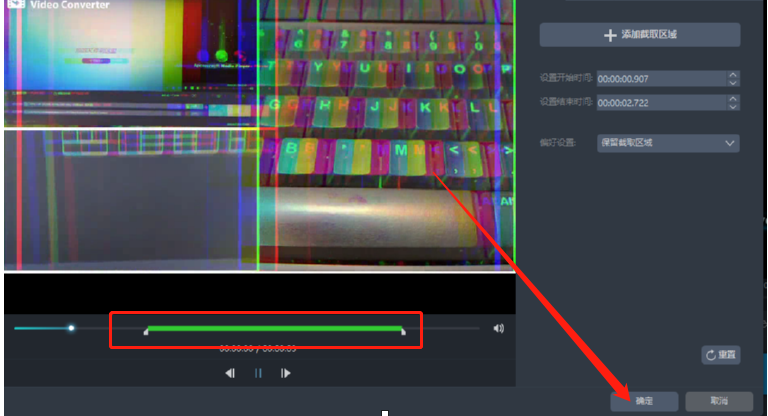 5.点击添加截取区域之后我们就可以在视频的进度条中调整想要剪切的视频片段位置了,选择好要剪切的位置之后我们点击下方的确定按钮即可。