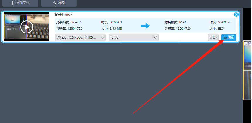 3.点击打开按钮将目标视频添加到软件界面之后,在界面中我们找到视频列表中的编辑按钮并点击进去。