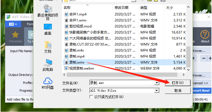 2.点击添加文件选项之后,下一步就会打开一个供我们选择文件的界面了,在这个界面中我们选中想要转换的WMV文件并点击打开。