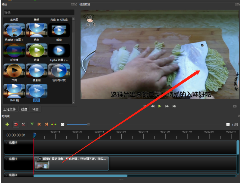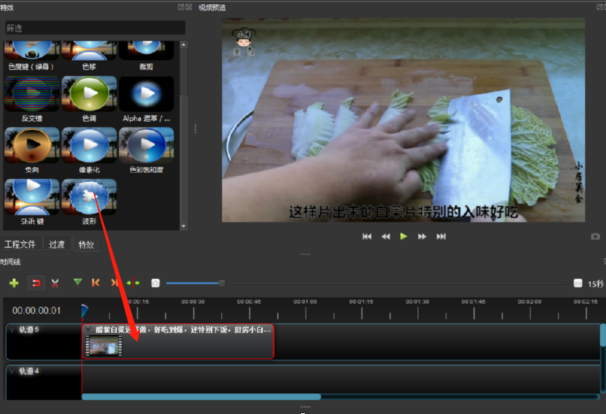 5.小编使用的是波形特效,移动到视频轨道上面之后就可以在右边的预览视频界面中看到视频就有波形特效了。