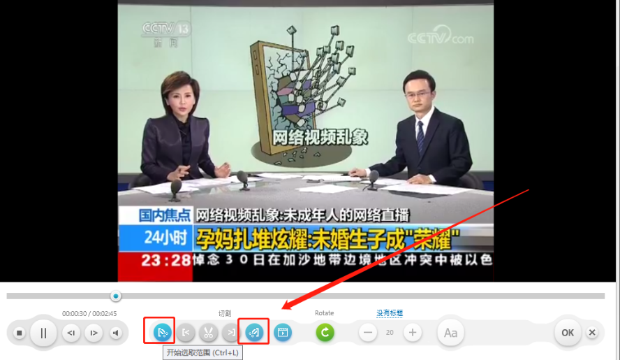 4.进入到剪切视频的界面中之后,我们看到下图中框出的这两个图标,左边是选择剪切开始时间的,右边是选择剪切结束时间的。