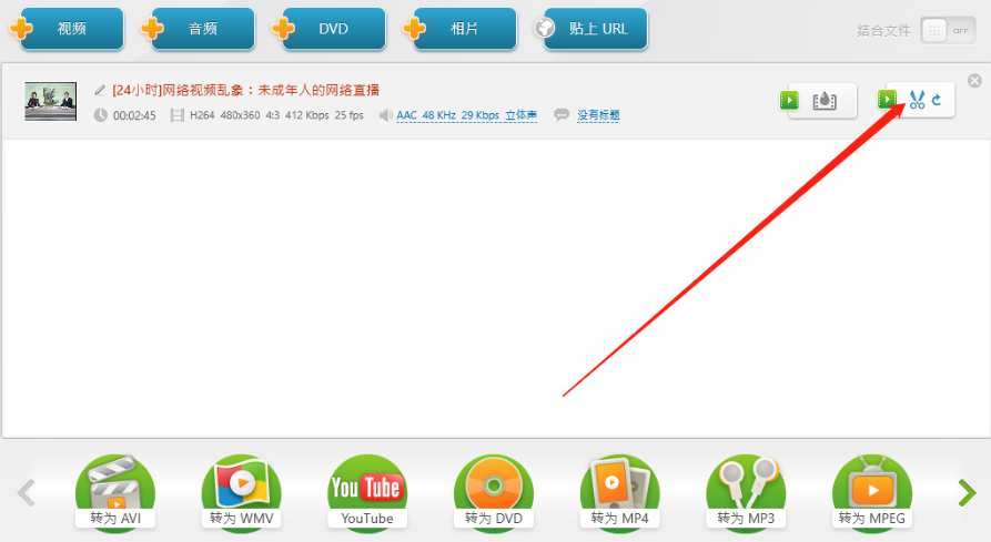 3.将需要剪切的视频成功添加到软件界面之后,我们点击视频列表右边的剪刀图标即可进入到视频剪切界面,如下图中所示。