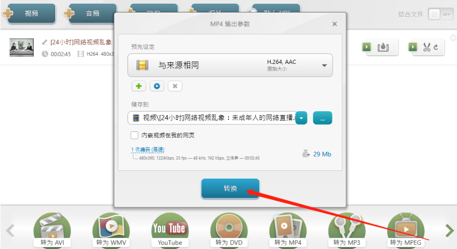 7.点击转换之后在输出参数界面可以设置储存的路径,设置完成之后点击下方的转换按钮就可以将剪切之后的视频保存下来了。