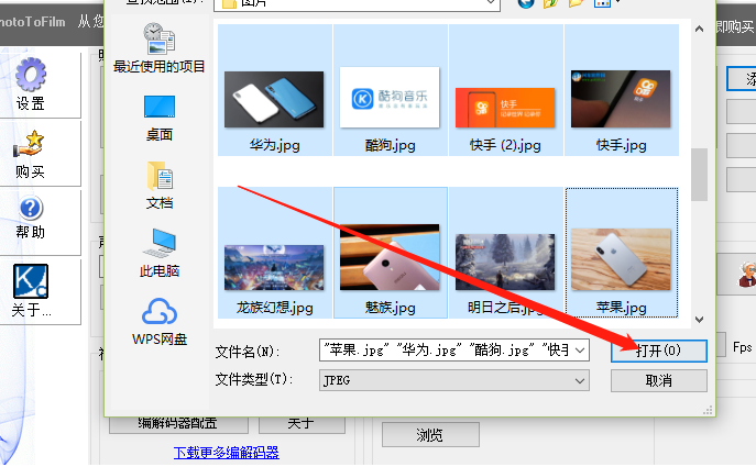 2.点击添加文件按钮之后,下一步就是在出现的界面中选择想要制作成视频的图片了,选择之后点击打开按钮。