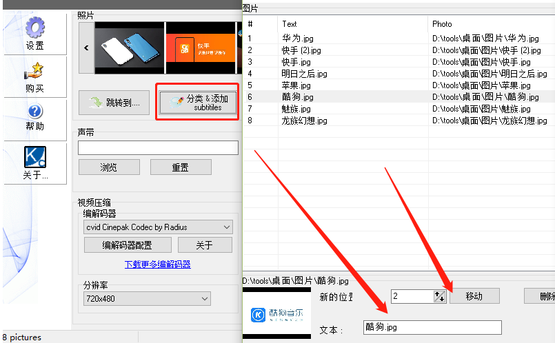 3.点击打开按钮之后,下一步我们点击软件界面中的分类&添加这个按钮即可打开编辑图片的界面,在界面中我们点击选中图片之后可以编辑图片文本,也可以调整图片的顺序。
