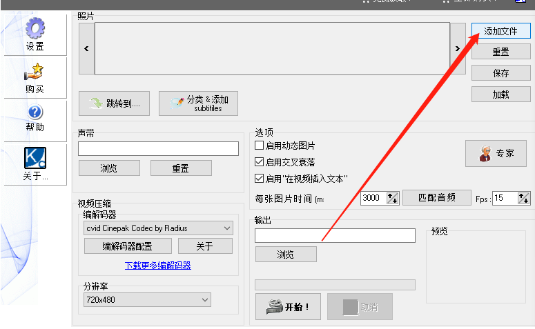 1.首先第一步我们打开软件之后,在软件界面的右上角点击添加文件按钮,点击添加文件之后添加要制作成视频的图片。