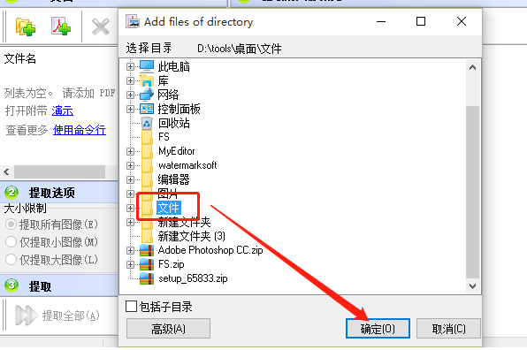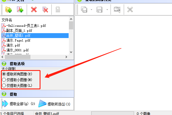 3.点击确定按钮之后软件就会自动识别文件夹中所有的PDF文件了,等到识别完成之后在提取选项界面中可以选择想要提取图片的大小限制。