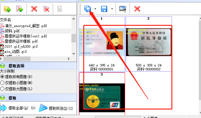5.点击提取之后等待一会,在我们界面中就会显示提取出来的一些图片预览了,然后我们点击界面上方的保存文件按钮,如下图中所示。
