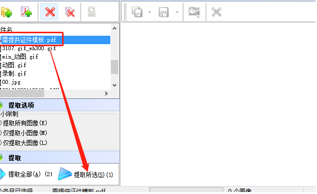 4.完成之后下一步我们就可以点击提取全部按钮进行提取了,也可以点击选中其中一个文件点击提取所选按钮,单独提取某个PDF文件。