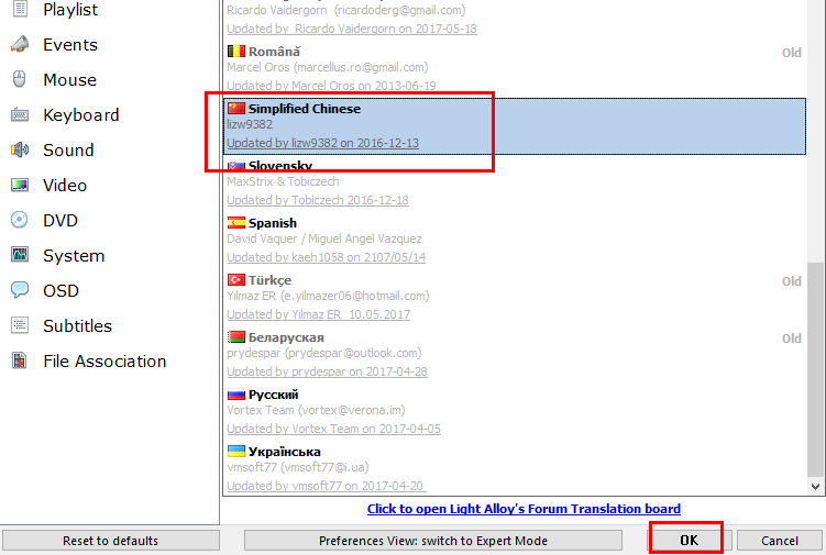4、随即,我们在language的语言选项下找到并选择【Simplified Chinese】,然后点击【OK】按钮保存设置即可。