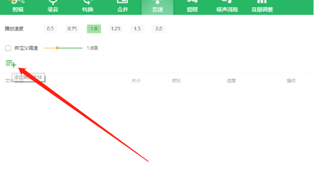 2.切换到变速功能界面之后,我们需要点击界面左边的添加文件按钮,点击之后即可添加要进行变速处理的音频文件。