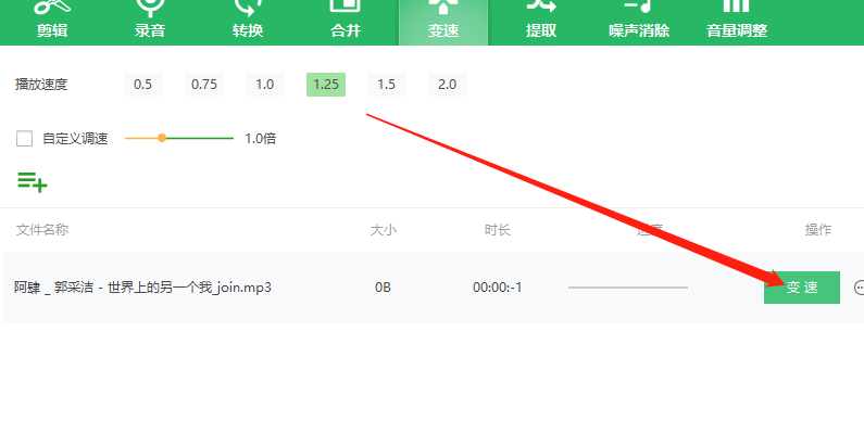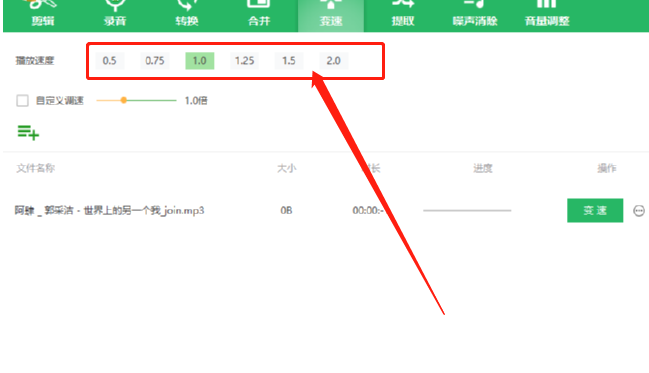 5.根据自己的需求在软件中调整好需要的播放倍速之后,我们就可以点击文件选项右边的变速这个功能按钮开始变速操作了。
