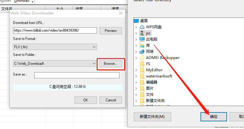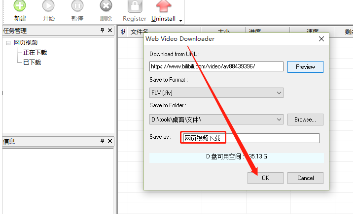 5.最后一步我们选择好储存地址之后,在Save as输入框中输入文件保存的名称之后,点击OK按钮就可以开始下载网页视频了。