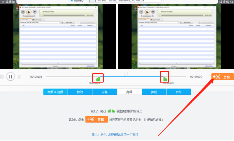 5.点击剪辑之后就进入到视频的剪辑功能界面当中了,我们移动视频进度条上面的两个绿色图标,然后选择想要剪切视频片段,选择完成之后点击旁边的剪辑按钮。