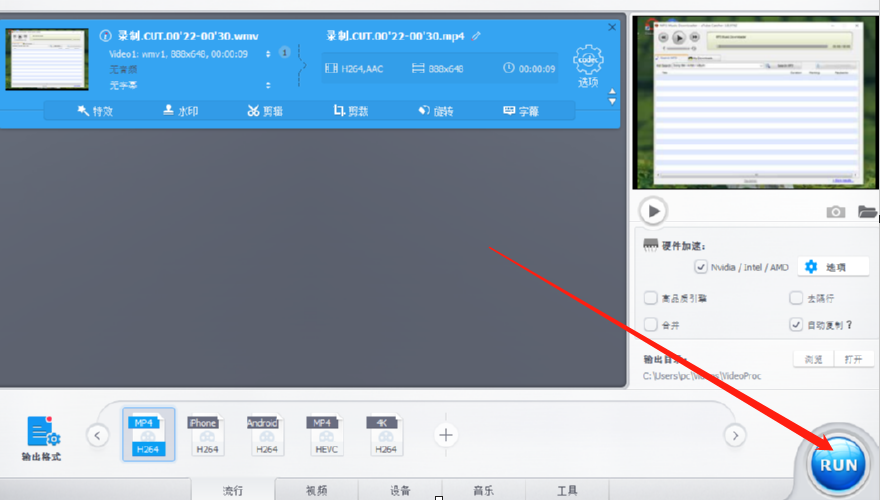 7.点击完成按钮之后就回到了软件的主界面,最后我们点击界面右下角的Run按钮就可以开始剪切选择好的视频片段了。