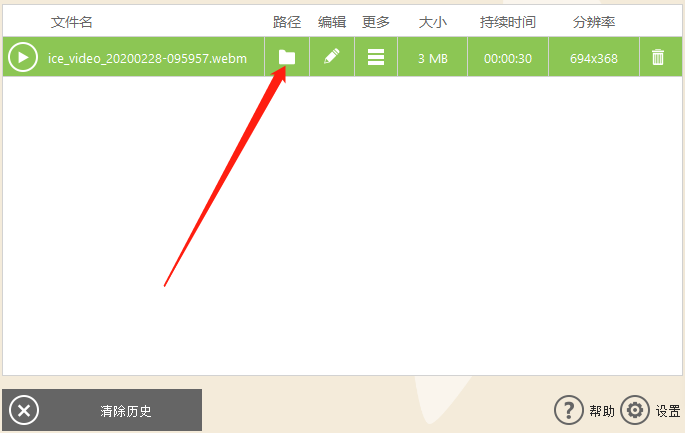 5.点击停止录制之后软件会自动保存刚才录制的视频,然后弹出下图所示的界面,其中就有录制好的视频文件,点击路径下方的文件夹图标即可打开查看录制的视频。