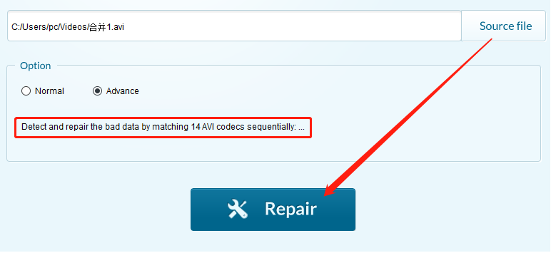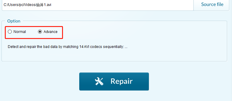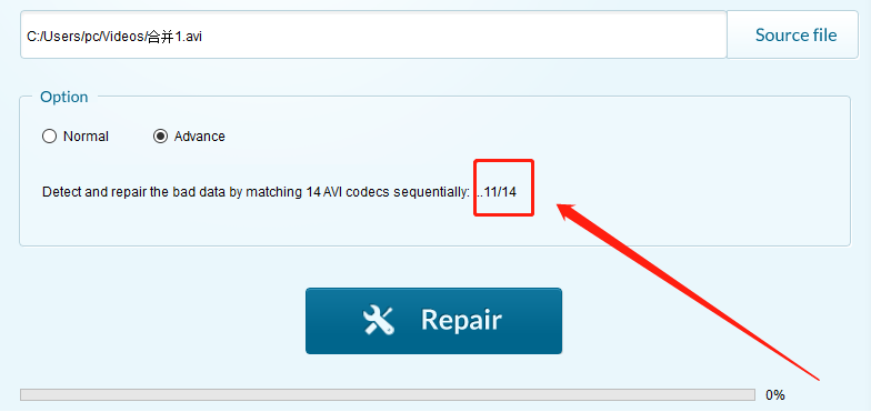 4.选择高级模式之后我们在下面的英文内容中可以看到在高级模式下软件会通过14中AVI编码器来帮助我们修复AVI视频,然后我们点击Repair按钮即可开启修复操作。