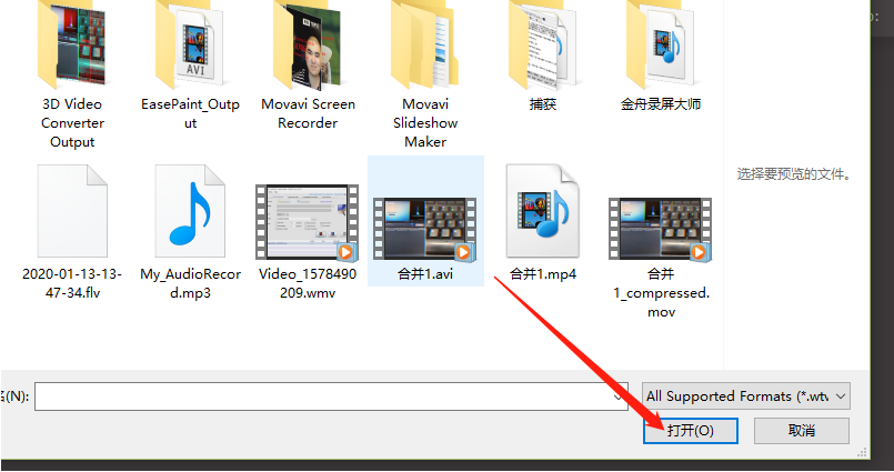 2.打开选择文件的界面之后,我们在界面中找到想要转换格式的AVI视频文件,选中之后点击右下角的打开按钮即可。