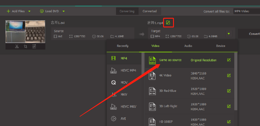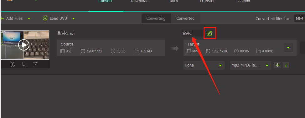 4.点击选择好转换的格式之后点击铅笔图标可以对文件转换之后的名称进行选择设置,更改名称之后方便区分两个视频文件。